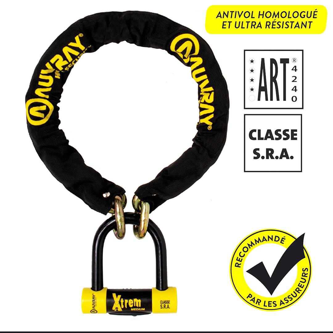 Auvray Xtrem, motosiklet ve scooter kullanıcıları için maksimum güvenlik sunan zincir ve disk kilit kombinasyonudur. Dayanıklı çelik zincir ve yüksek güvenlikli disk kilidi sayesinde hem şehir içi park alanlarında hem de uzun süreli park durumlarında üstün koruma sağlar. Disk kilidi ART ve SRA Class onaylı olup, motosiklet sigortaları için gerekli güvenlik standartlarını karşılar.
