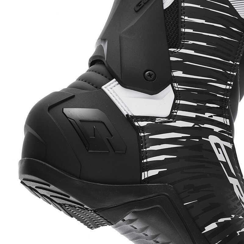GAERNE G-RX Racing siyah beyaz çizme, pist ve agresif yol sürüşleri için özel olarak tasarlanmış yüksek performanslı bir yarış botudur.