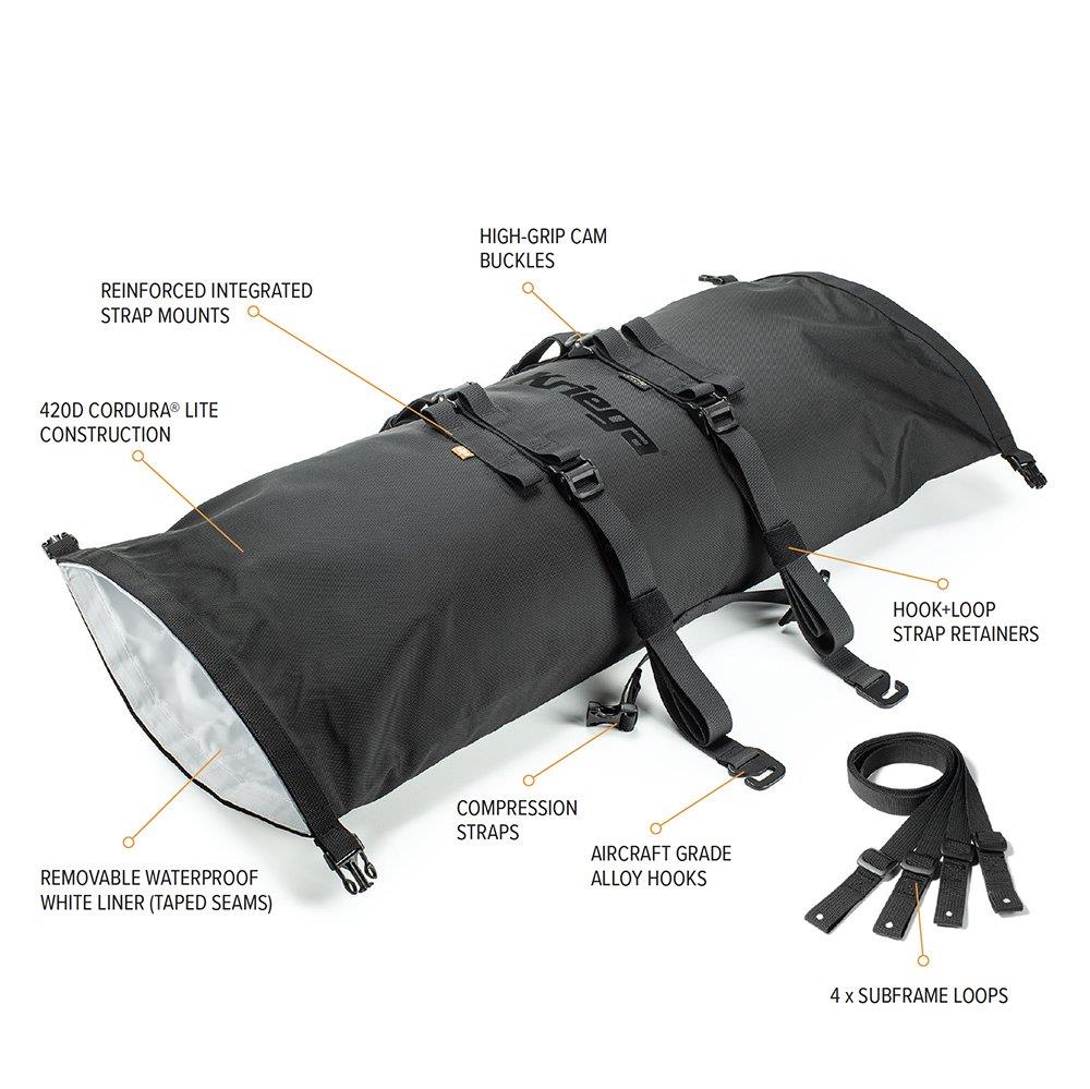 KRIEGA KRP20 ROLLPACK MOTOSİKLET ÇANTASI %100 su gerçirmez motosiklet çantalarından oluşur. Sağlam, hafif ve kolay takılan bir saklama çözümü arayan tüm motosiklet tutkunları için mükemmel bir aksesuardır. 500D Cordura® LITE dış kabuktan, bantlanmış dikişli iç astardan yapılmıştır. Eşyalarınız için maksimum koruma sağlayarak en zorlu koşullara dayanacak şekilde üretilmiştir. Çift uçlu sarmal kapak, her iki uçtan da kolay erişim sağlayan esnek bir su geçirmez çözüm sunar. ROLLPACK, bir arka rafa veya arka koltuğa güvenli bir şekilde oturacak şekilde tasarlanmıştır ve fazladan depolamaya ihtiyaç duyduğunuzda rulo haline getirilebilir ve motosiklet üzerinde veya bir sırt çantasında taşınabilir. Hızlı ve kolay takmak için entegre kam tokası kayışları bisiklet çerçevesinin etrafında döner ve çantaya geri kancalanır. Ek olarak, görünür çerçevesi veya rafı olmayan motosikletler için alt çerçeve döngüleri dahildir. Motosiklete takıldıktan sonra entegre kayışları alt çerçeve halkalarına asın ve sıkın. 20 Litre kapasiteli. %100 su geçirmez hafif çanta. Her türlü motosiklet türüne evrensel uyum Arkaya veya arka koltuk üzerinde kolay montaj Çift girişli top kapak Dayanıklı Cordura® yapı Taşımak/ saklama için toplanabilir.