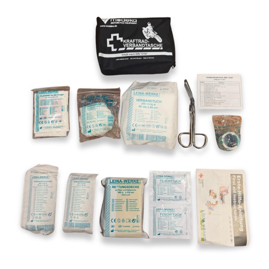 Modeka FirstAid 901, motosiklet sürücüleri için özel olarak kompakt boyutlarda tasarlanmış, profesyonel bir ilk yardım setidir. Uluslararası standartlara uygun içeriği ve dayanıklı çanta yapısı sayesinde, acil durumlarda ihtiyaç duyabileceğiniz temel tıbbi malzemeleri her an elinizin altında tutmanızı sağlar.