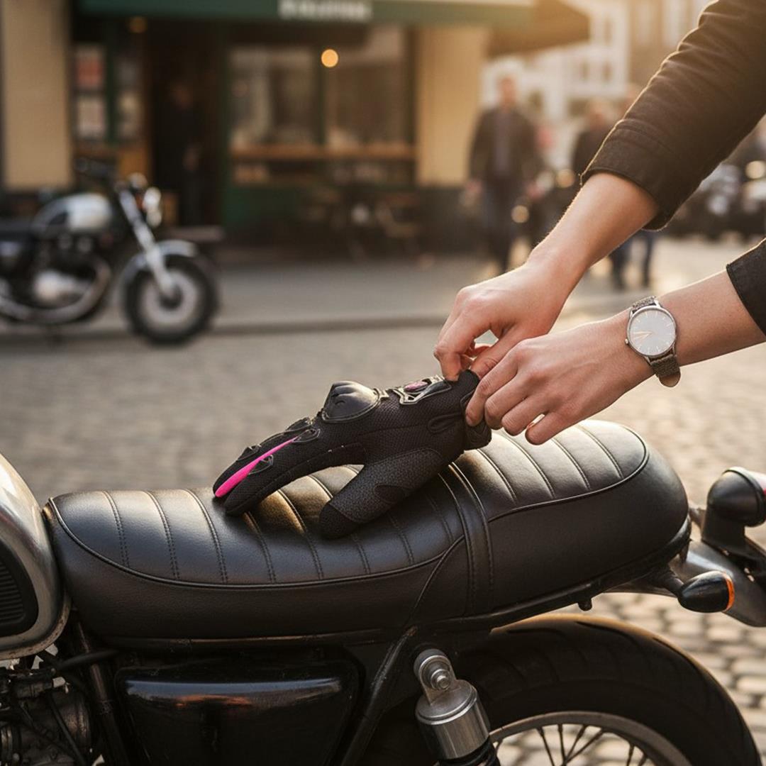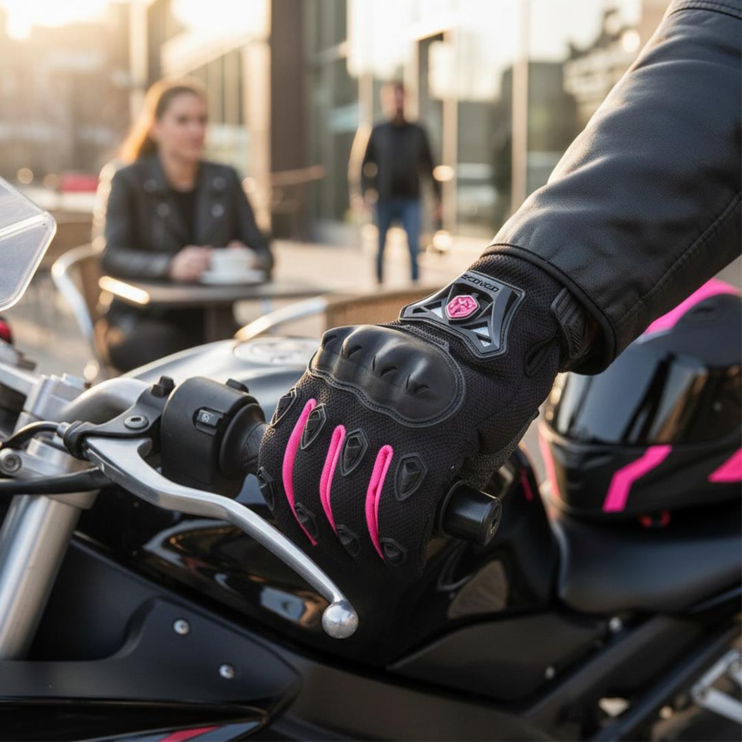 Bilekteki ayarlanabilir cırt kapama eldivenin elinize tam oturmasını sağlar ve sürüş sırasında stabil durur. Şık pembe detaylarıyla hem koruma hem de tarz arayan kadın motosiklet kullanıcıları için ideal bir seçimdir.